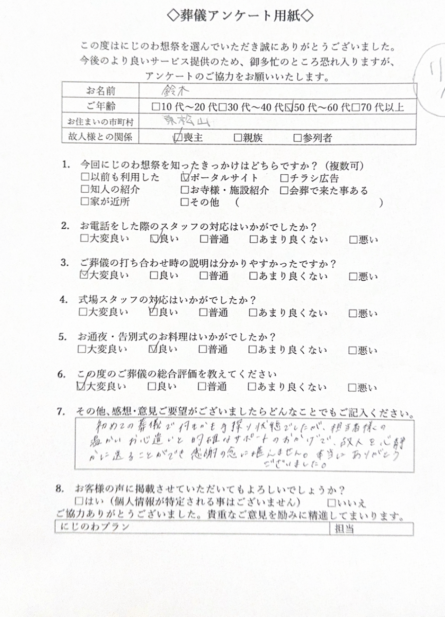 初めての事ですし、葬儀は数多く経験することではないので分からないこといっぱいですよね。質問いっぱいしていだだけたので、逆にしっかりとS様のお手伝いができたと思います。