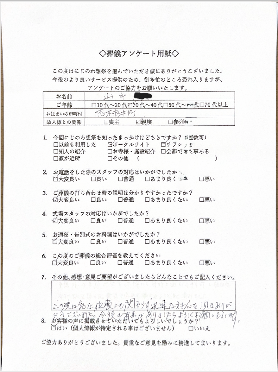 山中様からアンケート頂きました。 2026/01/26 葬儀アンケート用紙 山中家 山中様大変お世話になりました。 この度はお忙しい中アンケートにご協力いただきありがとうございました。 このような温かいお言葉が凄く励みになります。 今後もなにかご不明なことなどございましたらご連絡ください 突然のことでお疲れだと思います。どうか無理をなさらずご自愛ください。 •